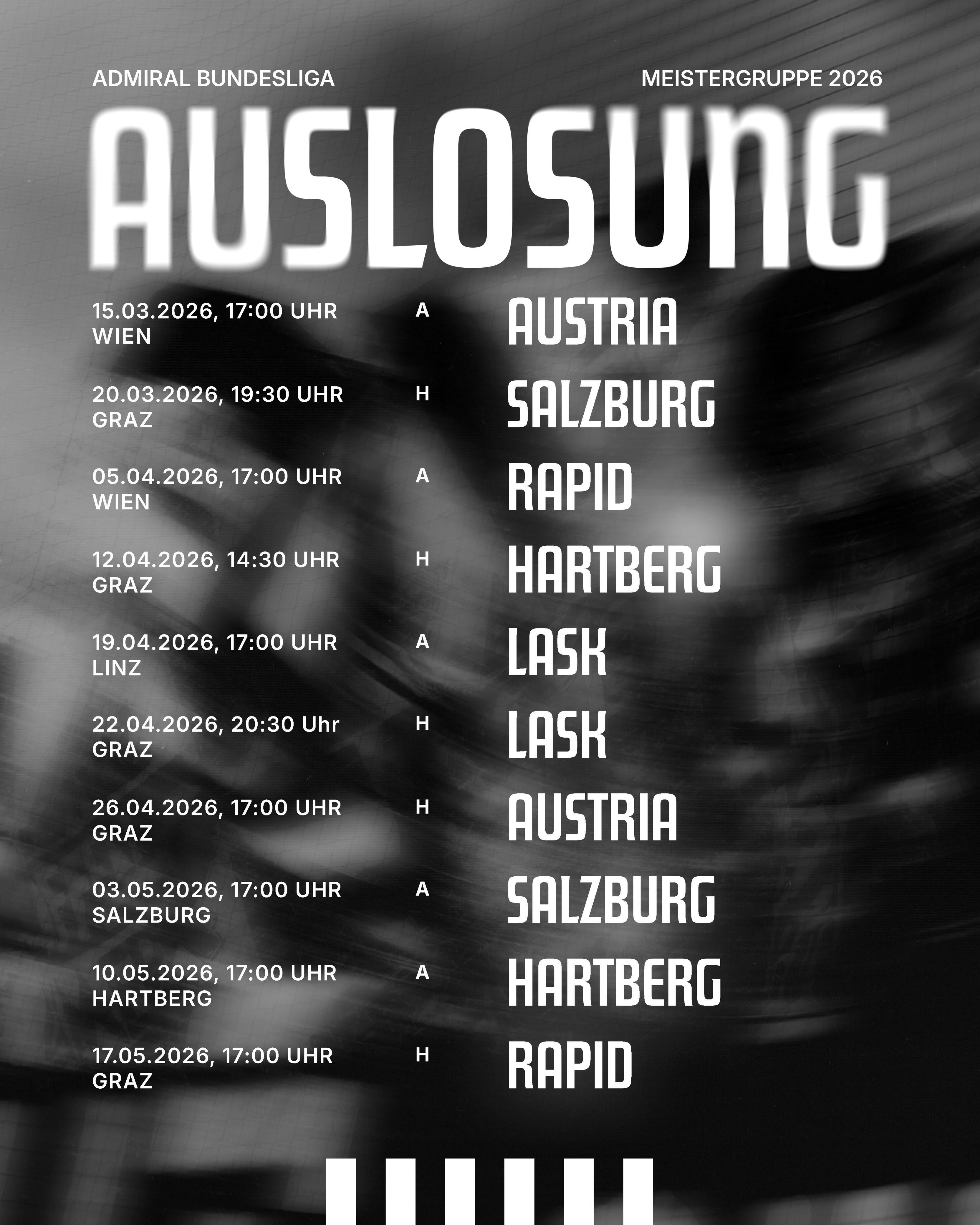 Am heutigen Sonntag wurde unser Spielplan der Meistergruppe der ADMIRAL Bundesliga ausgelost. Zum Auftakt auswärts nach Wien zur Austria.