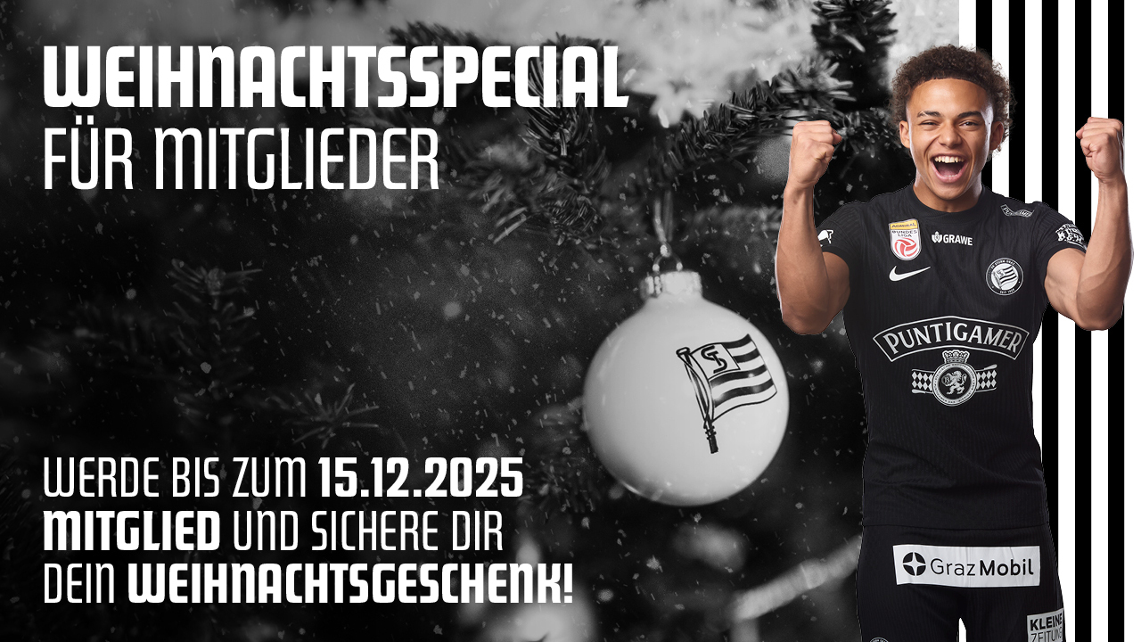 Die Vorweihnachtszeit rückt näher und mit ihr die Frage nach dem perfekten Geschenk. Für alle, die einem Sturm-Herz eine Freude machen möchten oder sich selbst etwas Schwarz-Weißes unter den Christbaum legen wollen, gibt es heuer wieder ein ganz besonderes Angebot: ein Weihnachtsspecial für Neumitglieder. Alle, die bis zum 15. Dezember 2025 ihren Mitgliedsantrag online stellen, erhalten ihre Mitgliedschaft inklusive Mitgliedskarte sowie einem kleinen Weihnachtsgeschenk rechtzeitig vor dem Fest per Post zugeschickt. Damit die Aktion genutzt werden kann, muss beim Antrag das Eintrittsdatum 1. November oder 1. Dezember auszuwählen. Die Monate November und Dezember gibt es als Weihnachtsbonus geschenkt dazu – der Mitgliedsbeitrag wird erst im Jänner fällig.